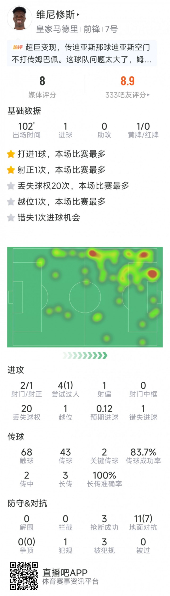 直播吧2月1日讯在本轮西甲,皇马2-1战胜巴列卡诺,维尼修斯破门,以下为他在本场数据: